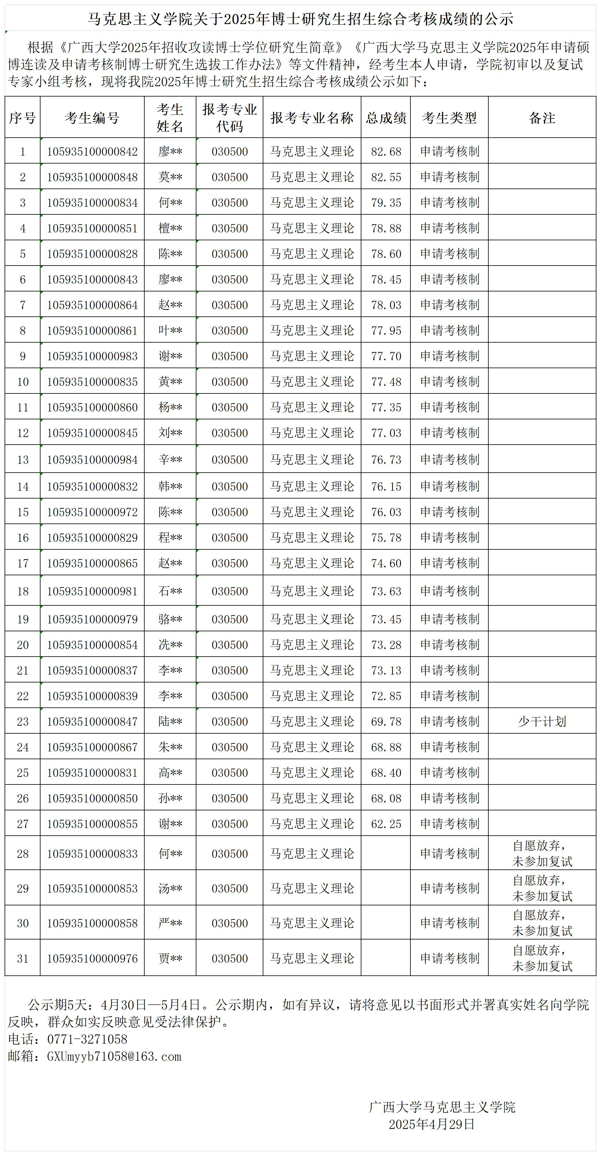 马克思主义学院关于2025年博士研究生招生综合考核成绩的公示