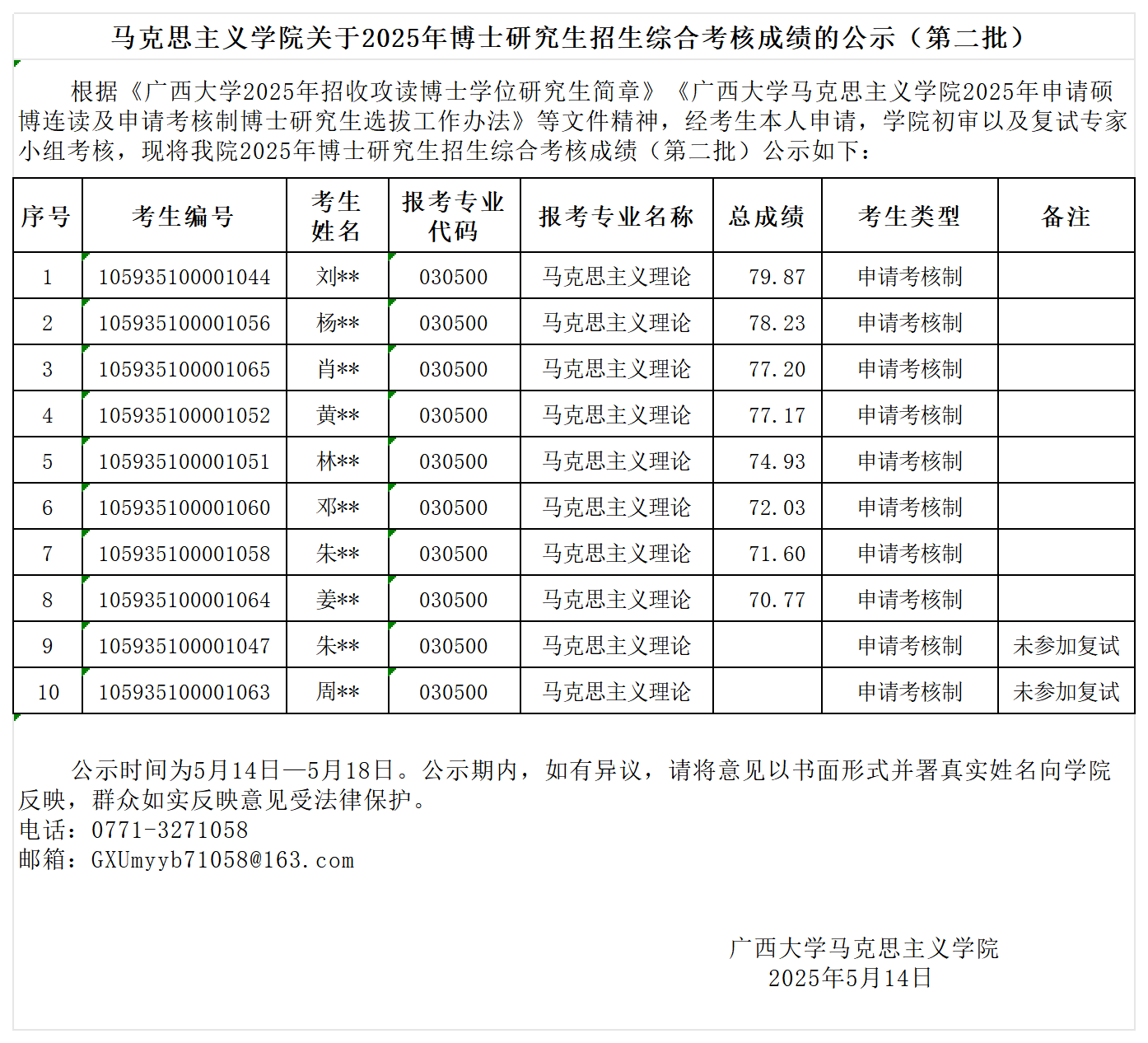 马克思主义学院关于2025年博士研究生招生综合考核成绩的公示(第二批)