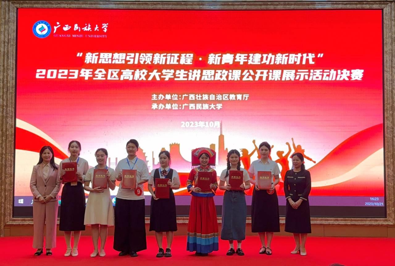 10月21日,由广西壮族自治区教育厅主办的“新思想引领新征程•新青年建功新时代”2023年全区高校大学生讲思政课公开课展示活动决赛在广西南宁举行。我院蓝波涛、李海波、黄宗芬老师指导的《从宣传标语中感悟党的群众路线》团队在众多参赛团队中脱颖而出,以优异成绩斩获一等奖。该作品由龙紫璐主讲,团队成员为洪佳佳、覃如峥、朱珠、姚璐、徐富林。