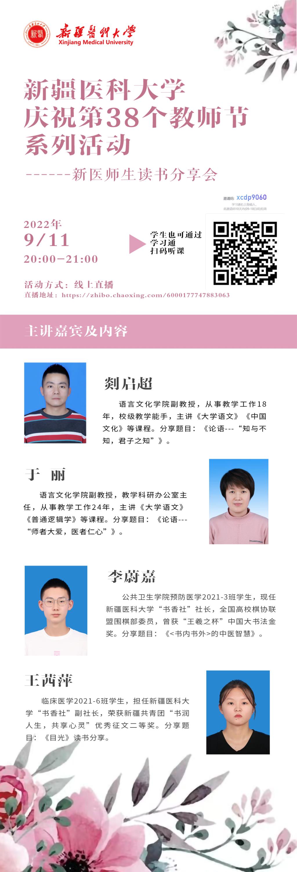 9月11日,新疆医科大学庆祝第38个教师节系列活动——新医师生读书分享会在线上顺利举行,活动由教务处主办,图书馆、校团委、学生处协办。