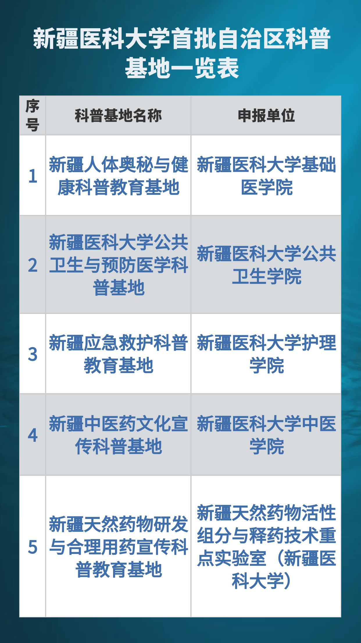 近日,自治区科协联合自治区党委宣传部等六家单位开展了2021-2025年度第一批自治区科普教育基地认定工作,通过多轮评审,我校5家单位获批自治区级科普基地。