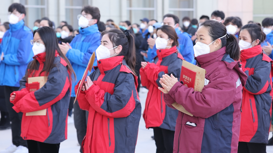 和田市为此次支援新冠肺炎疫情核酸检测工作的新疆医科大学各所附属院医护人员举行欢送仪式。