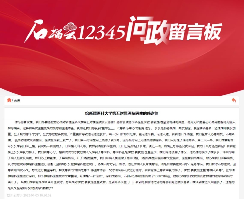 “今日,我们怀着感激的心情,对新疆医科大学第五附属医院表示感谢,感谢贵院急诊科医生伊敏·赛麦提在疫情特殊时期,用无私的爱心和高尚的医德为病人解除痛苦……”2023年1月3日,网友“橙子”在“石榴云12345问政”留言板写下了一封暖心的长篇感谢信。