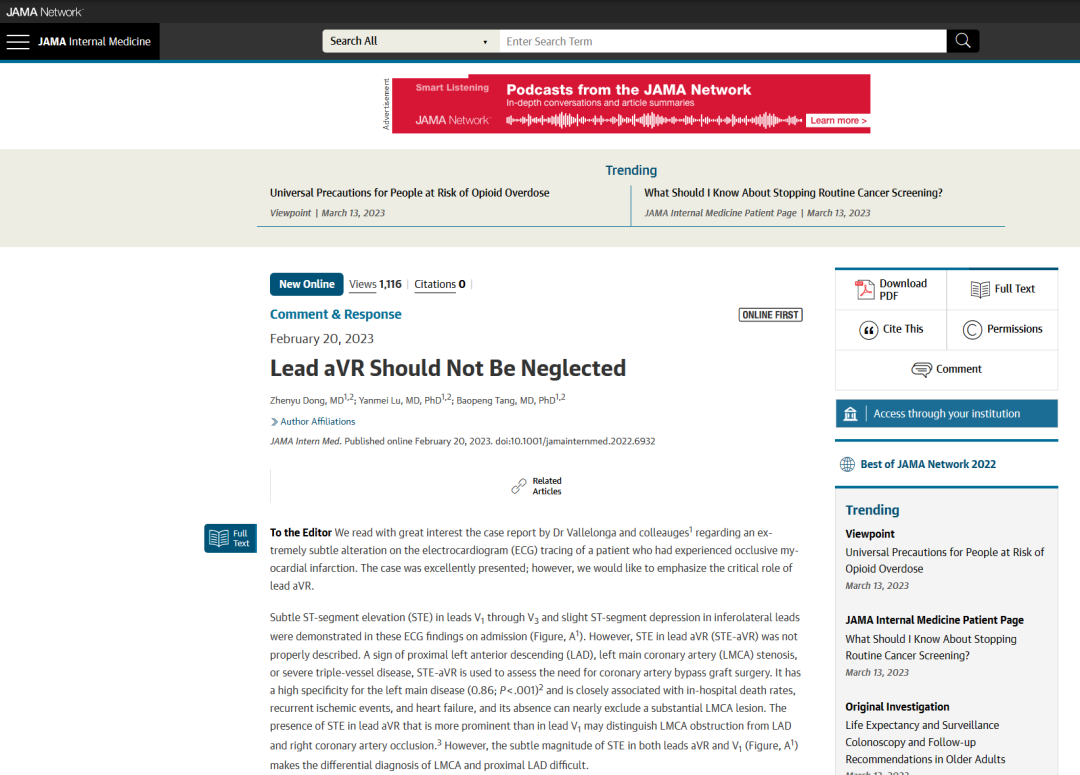 近日,新疆医科大学第一附属医院汤宝鹏教授领衔的心脏起搏电生理团队在国际顶级医学期刊JAMA internal medicine(影响因子44.4)上连续发表两篇评论文章,“Flecainide-Associated QRS Complex Widening—What Really Matters”和“Lead aVR Should Not Be Neglected”,分别对该期刊的原有研究论文进行评论。