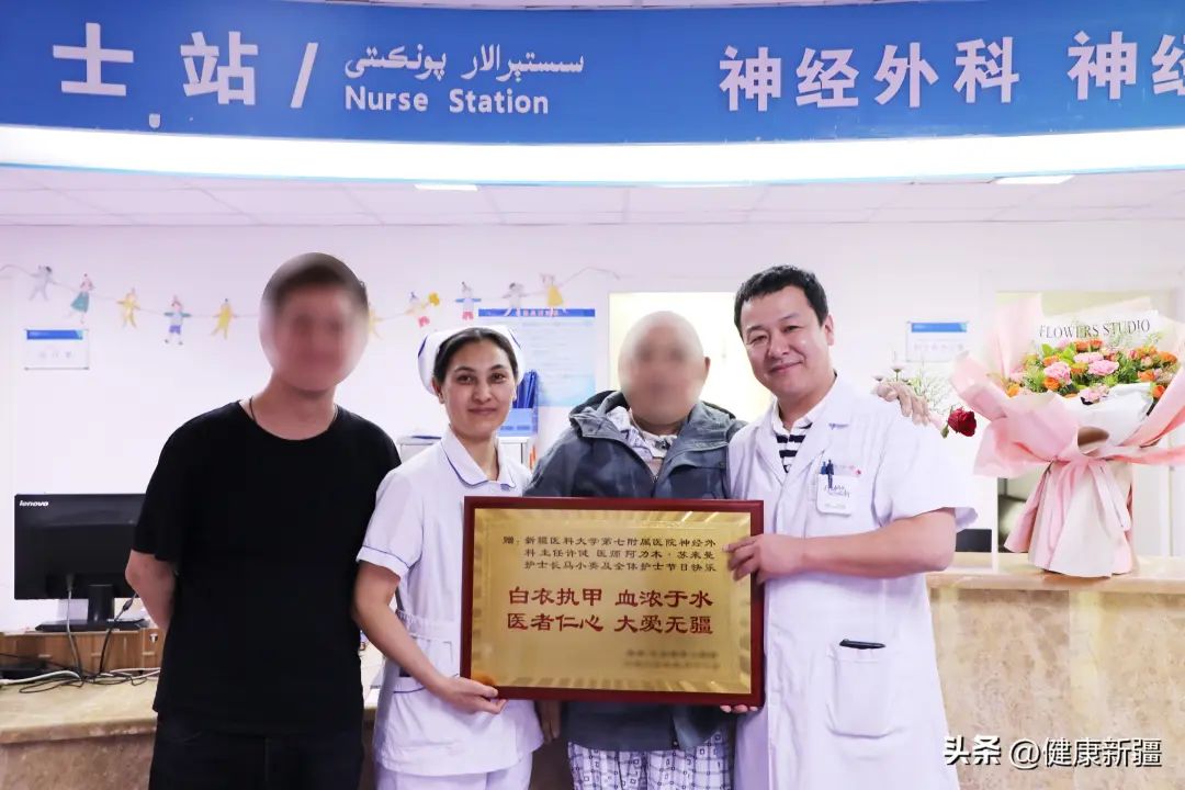 尽管父亲尚未出院,阿先生前两天还是将特意定做的一面牌匾送到新疆医科大学第七附属医院神经外科,感谢科室医护人员的精心诊疗,让入院时昏迷不醒的父亲如今能自如地说话、吃饭,还能借助助行器四处行走。