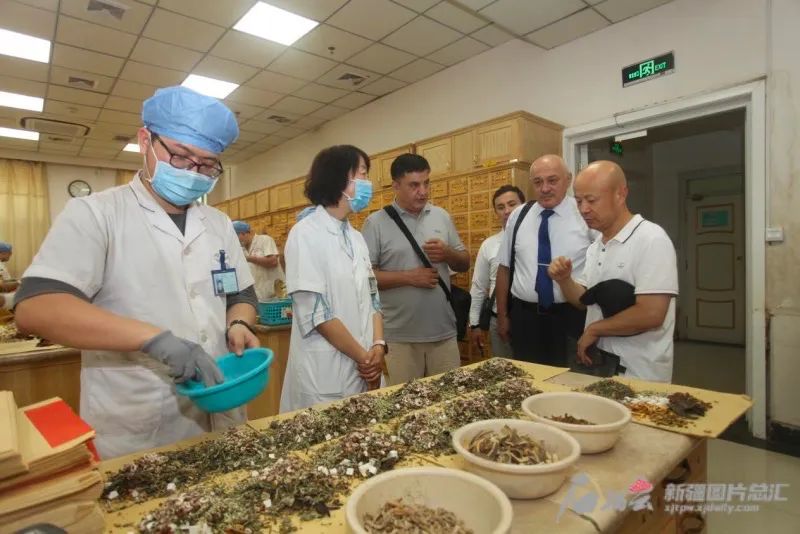 7月27日,来自乌兹别克斯坦的骨科专家参观自治区中医医院药房。马莹摄