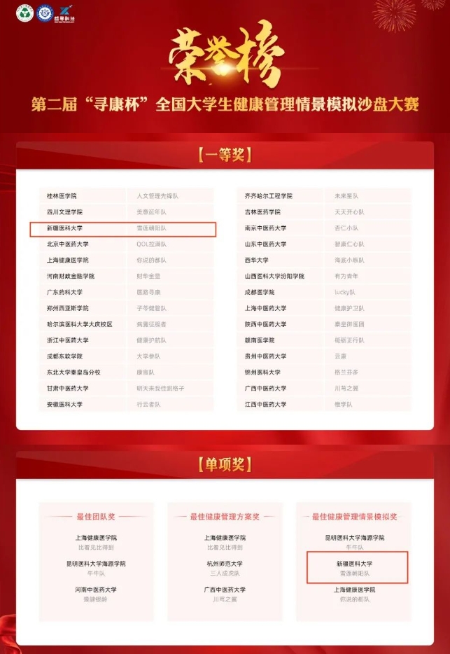 近日,由中国老年保健协会主办的第二届全国健康服务与管理教育论坛暨“寻康杯”全国大学生健康管理情景模拟沙盘大赛落幕。新疆医科大学参赛团队以优异成绩荣获全国一等奖和“最佳健康管理情景模拟奖”单项奖。