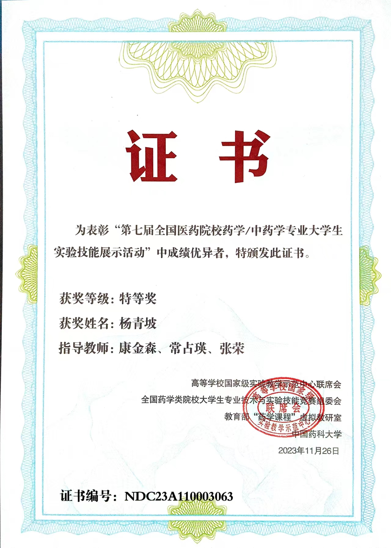祝贺我校药学专业 杨青坡同学 顾圆村同学