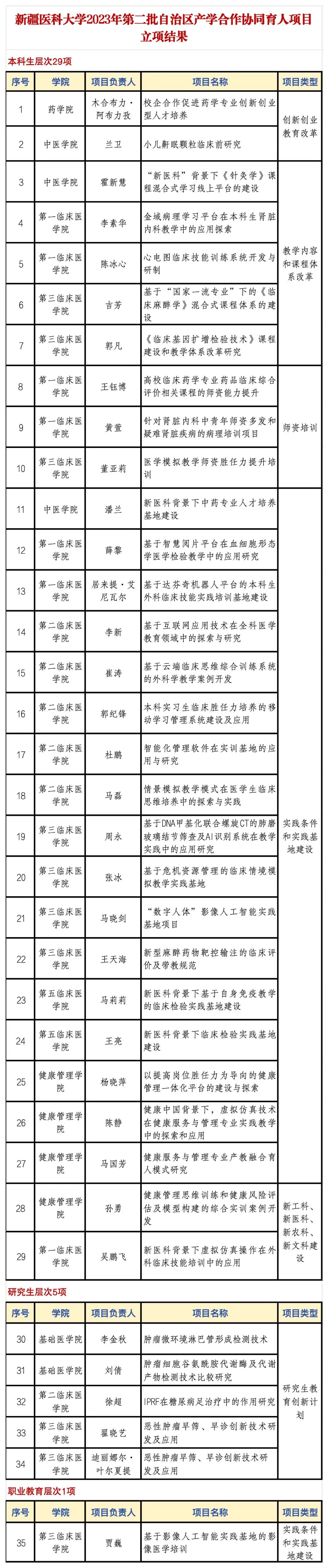 近日,自治区教育厅、发改委、工信厅、国资委四部门联合印发《关于公布2023年第二批自治区产学合作协同育人项目立项名单的通知》,新疆医科大学共有35项协同育人项目获批立项。其中,面向本科生层次29项,研究生层次5项,职业教育层次1项。