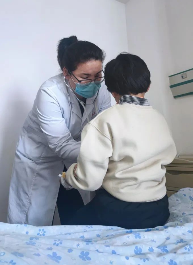 2月10日,在新疆医科大学第五附属医院儿科病房,医生江丽汗·阿黑哈提正在为刚入院患儿做听诊检查。