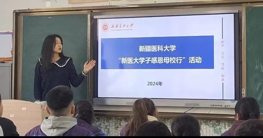 我以一名学姐的身份向学弟学妹们介绍了我的大学——新疆医科大学,给他们看了新疆医科大学的宣传片,介绍了学校雄厚的师资力量和优美的校园风光等。我为新疆医科大学感到骄傲,同时也鼓励学弟学妹们全力以赴、笃定前行,真切的希望学弟学妹们能够考入理想的大学。