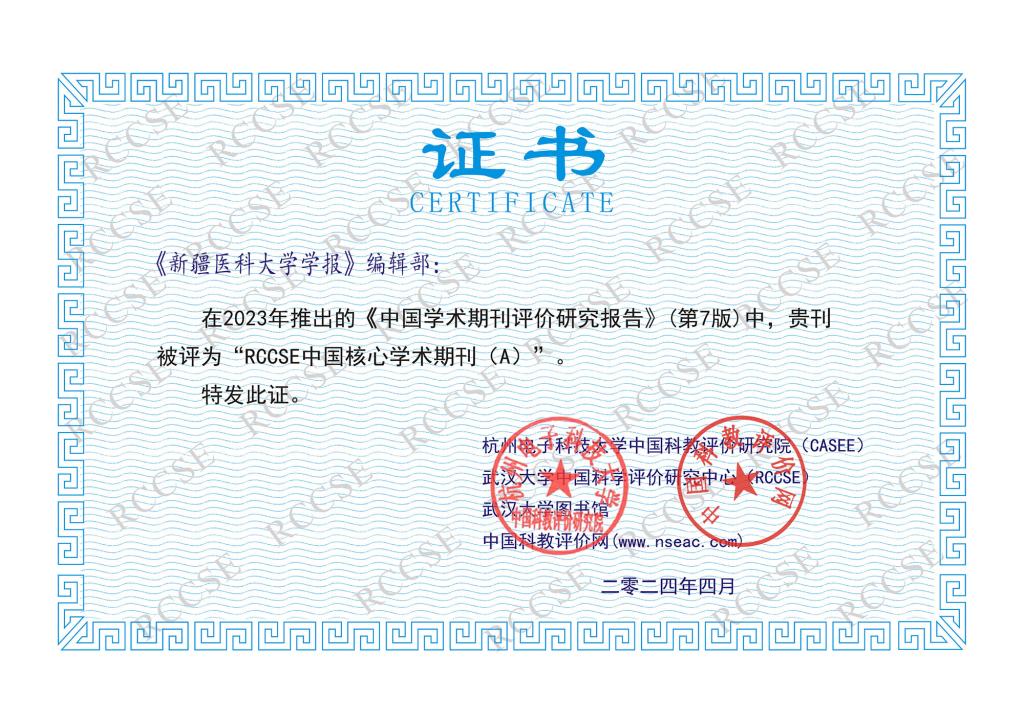2024年4月,《中国学术期刊评价研究报告(第7版)》正式发布,《新疆医科大学学报》再次入选“RCCSE中国核心学术期刊(A级)”。《中国学术期刊评价研究报告(第7版)》显示,此次共认定及收录中文学术期刊6622种,按学科分类,根据期刊的综合评价得分排名划分等级。其中,A+等级为权威期刊,即排名前5%的期刊;A等级为核心期刊,为排名前5%-20%的期刊。