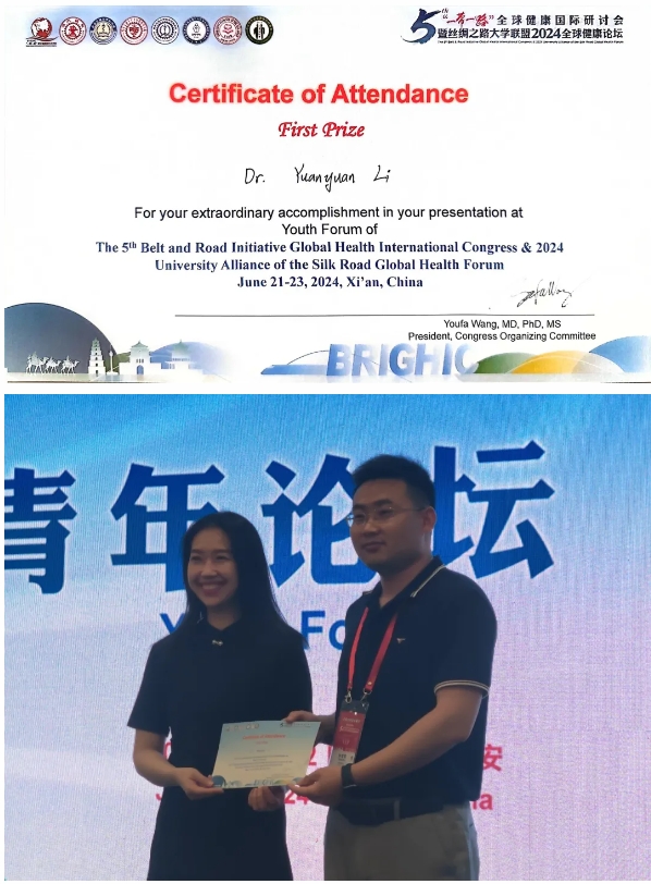 6月21日,第五届“一带一路” 全球健康国际研讨会暨2024年丝绸之路大学联盟全球健康论坛在西安举行。我校公共卫生学院2022级学术型博士李媛媛(导师:戴江红教授),在青年论坛中汇报研究“Association between visceral fat-to-muscle mass ratio and severe exacerbations of chronic obstructive pulmonary disease patients: A Prospective Cohort Study”,取得一等奖的优异成绩。