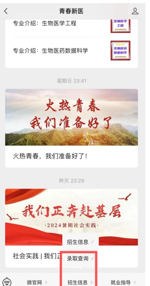 02进入公众号,选择底部菜单栏“招生信息”,点击“录取查询”,即可进行查询。