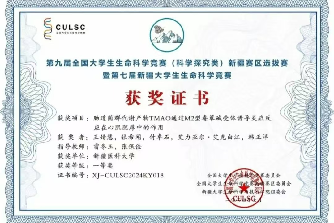 近日,在刚刚结束的第九届全国大学生生命科学竞赛(科学探究类)决赛中,新疆医科大学儿科学院临床医学(“5+3”一体化)(儿科学)2021-4班王婧慧、张希闻团队在决赛中获得国家级二等奖、省级一等奖的好成绩。