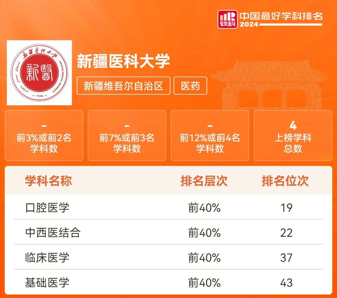 10月15日,高等教育评价专业机构软科正式发布“2024软科中国最好学科排名”榜单,我校口腔医学、中西医结合、临床医学、基础医学学科进入前40%。