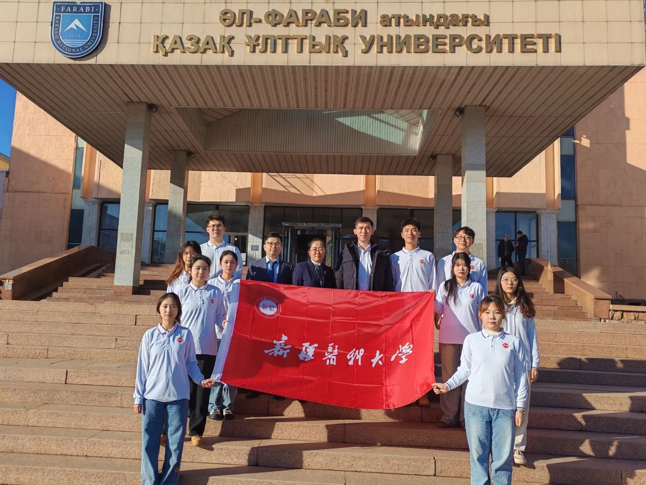 访学团在哈萨克斯坦阿里-法拉比国立大学前合影留念