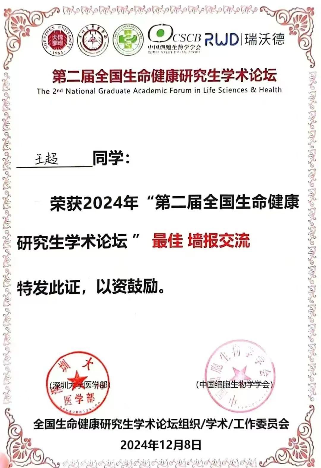 来自儿科学院2022级博士研究生王超荣获“最佳墙报交流”(一等奖),其汇报主题为《Human umbilical cord mesenchymal stem cells alleviate white-matter injury in neonatal rats by regulating phenotype polarization of microglia》,指导教师为朱艳萍教授。