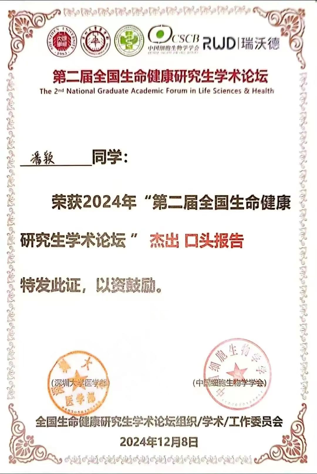 来自第一临床医学院2023级博士研究生潘颖荣获“杰出口头汇报”(二等奖),其汇报主题为《Decreased free fatty acid levels associated with adverse clinical outcomes in coronary artery disease patients with type 2 diabetes: Findings from the PRACTICE study》,指导教师为谢翔教授。