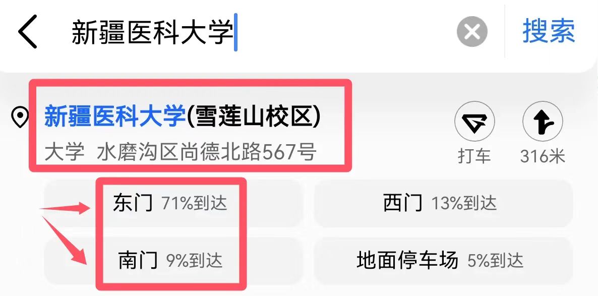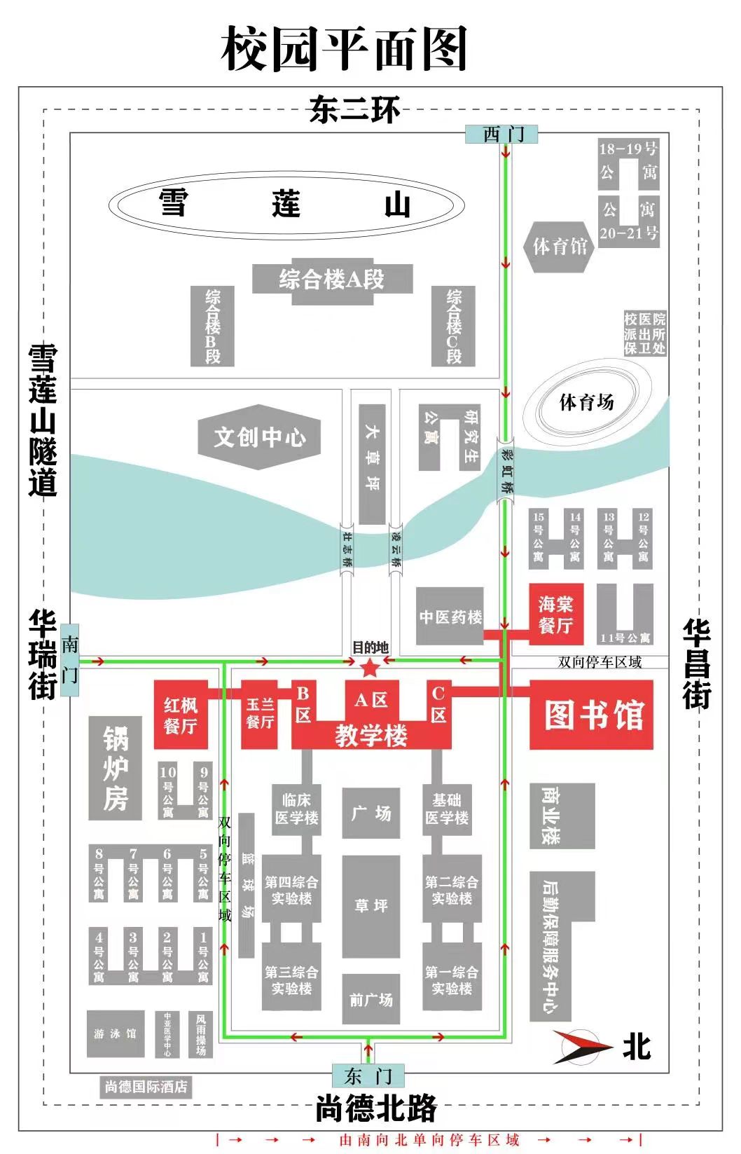 新疆医科大学考点考场在雪莲山校区教学楼B段、C段,考生从校区东门、南门、西门入校。请考生使用“高德地图”手机App搜索“新疆医科大学雪莲山校区东门或南门”,提前乘坐出租车、网约车赴考,告知司机在雪莲山校区东门或南门下车。送行车辆,即停即走,考生自驾车须按照交警或引导员指引将车辆有序停放在校区东门外尚德北路(由南向北)单侧道路、校内图书馆前两侧道路、风雨操场至玉兰餐厅之间两侧道路。