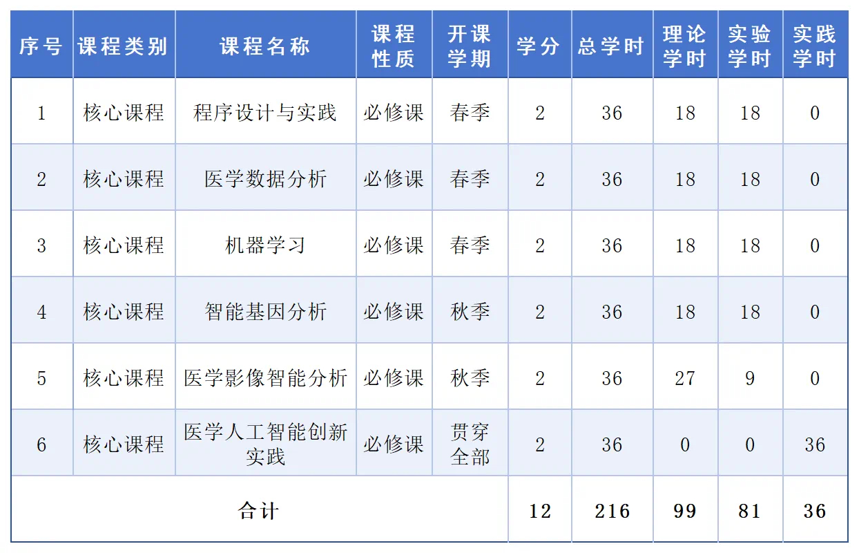 “医学人工智能”微专业通过精心设计的6门核心课程,旨在培养学生掌握医学影像分析、基因组学分析、辅助诊断、临床决策等医学人工智能的基本理论、方法和技术,提高学生的实践创新能力,为学生将人工智能技术应用于医学领域打下基础。