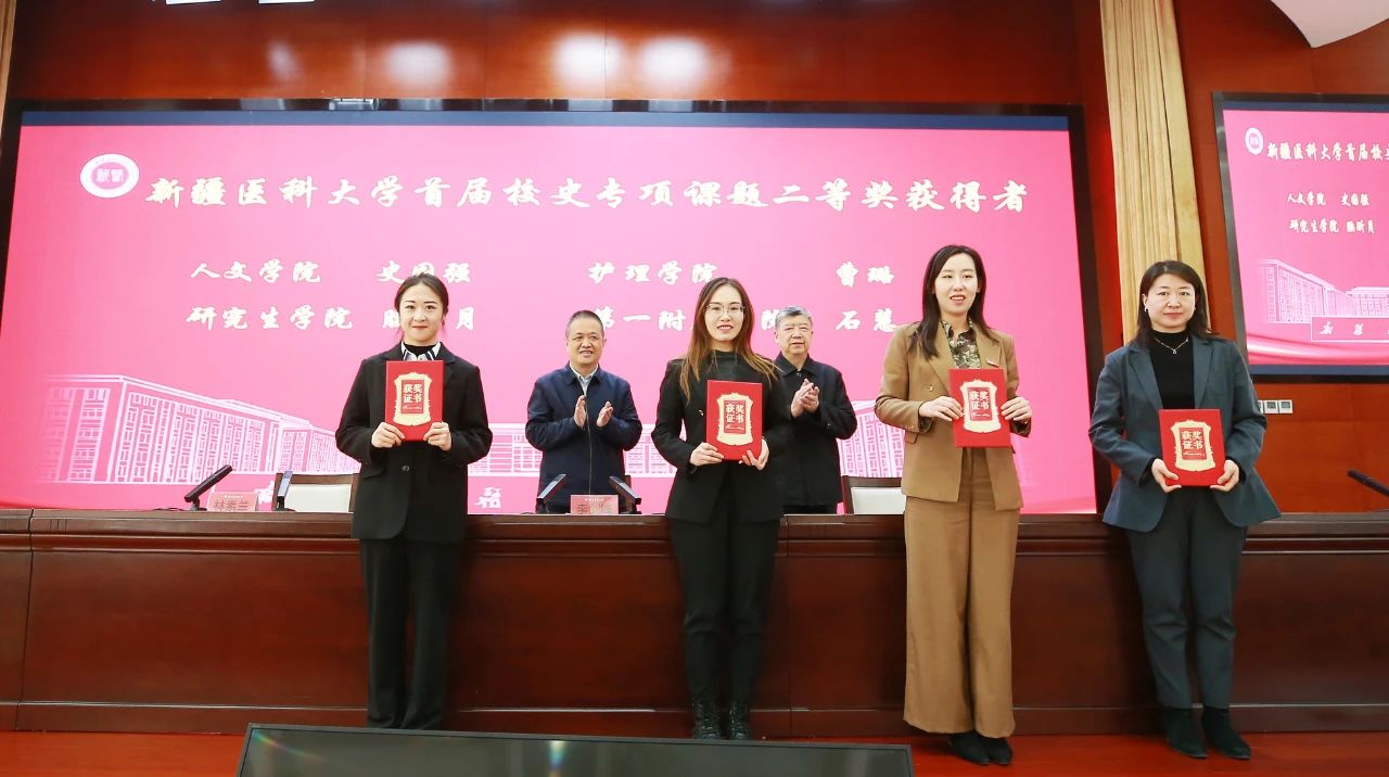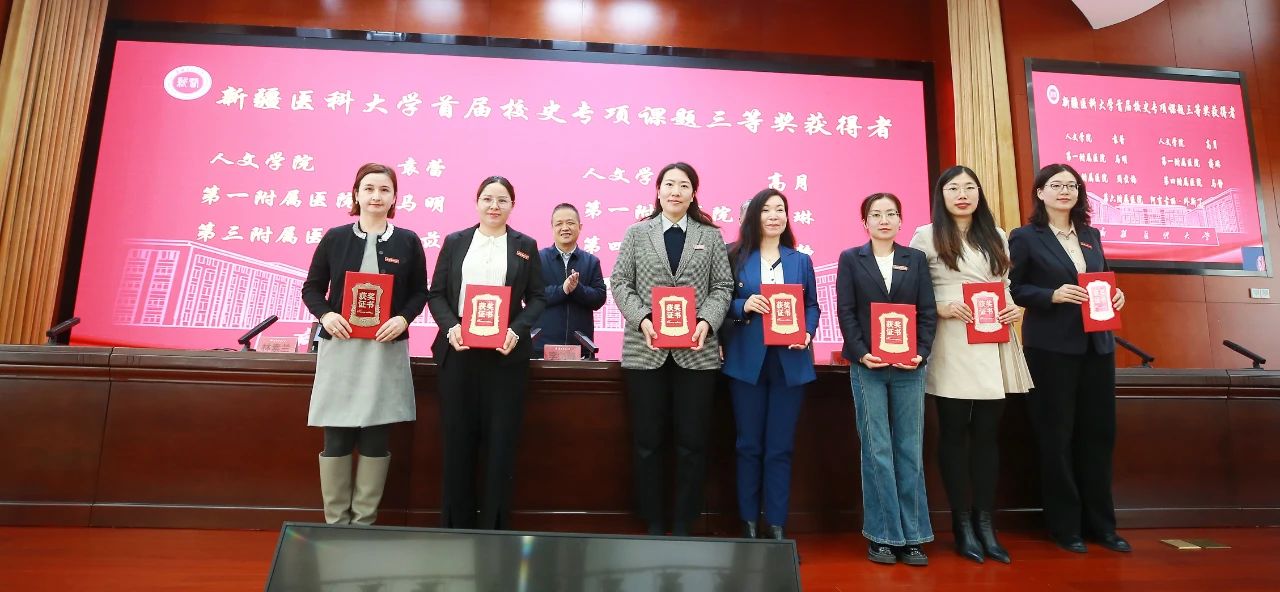 校史专项课题研究成果获奖者代表,第一附属医院(第一临床医学院)赵静、中医学院姜德团队的孙元鹤、科学技术处的蒋红分别作了《以新疆医科大学第一附属医院发展各阶段的不同领域具有突出代表性人物的史料挖掘和整理》《“西北燥证”研究脉络传承》《新疆医科大学在新疆重大疾病、特高发病防治方面研究的相关校史史料挖掘》的交流汇报。