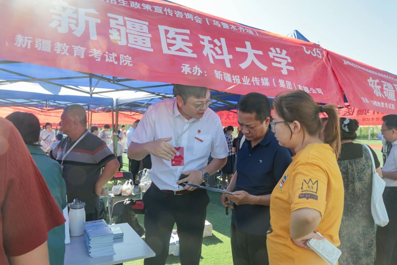 在新疆医科大学宣传展位前,前来咨询的考生络绎不绝,展位上摆放着精美的招生手册,不少考生认真翻阅,并结合自身兴趣和成绩,向老师寻求报考建议。我校招生工作人员热情接待每一位考生和家长,耐心解答关于专业设置、录取分数线、就业前景、校园环境等问题,欢迎大家报考新疆医科大学。