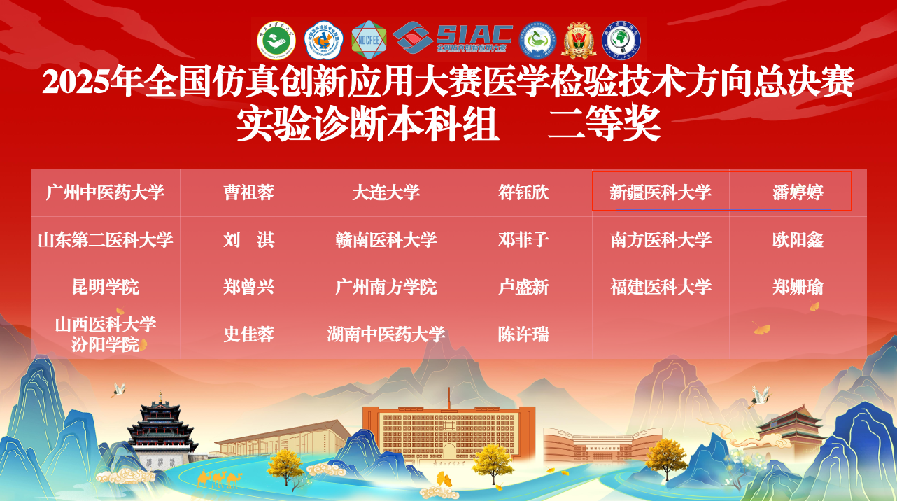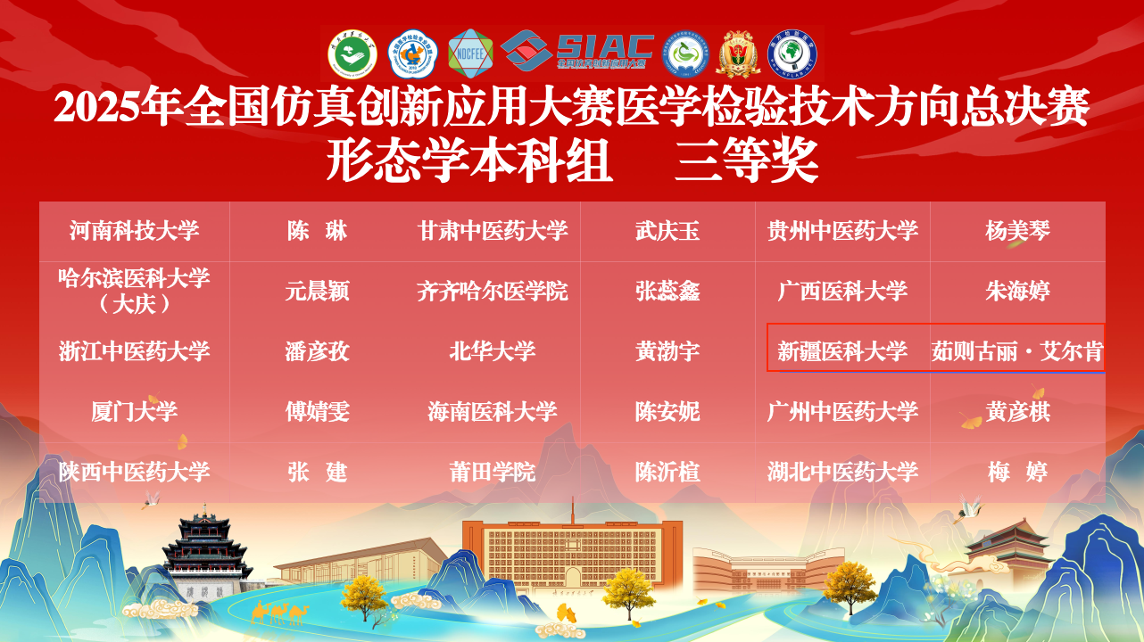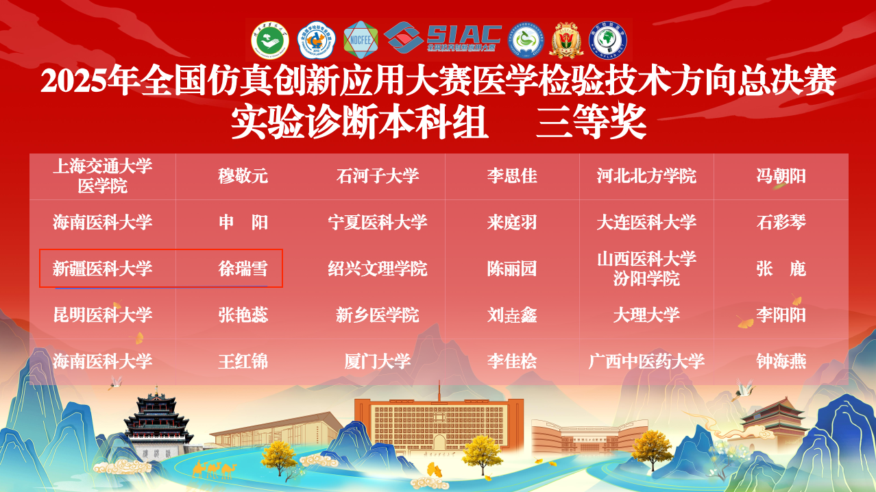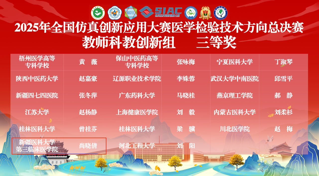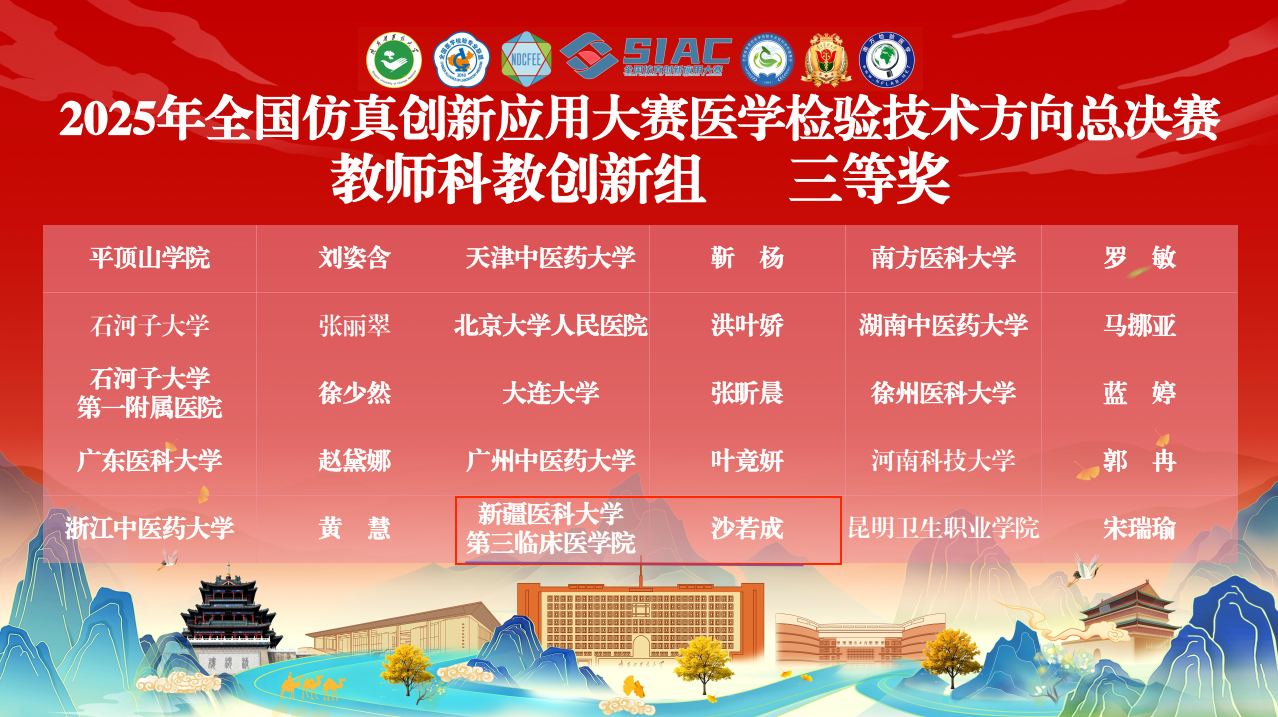 7月17—20日,由工业和信息化部人才交流中心主办的2025年全国仿真创新应用大赛医学检验技术组总决赛在陕西中医药大学举行,新疆医科大学在此次大赛中获得佳绩,学生团队荣获二等奖2项、三等奖2项,教师荣获三等奖2项。