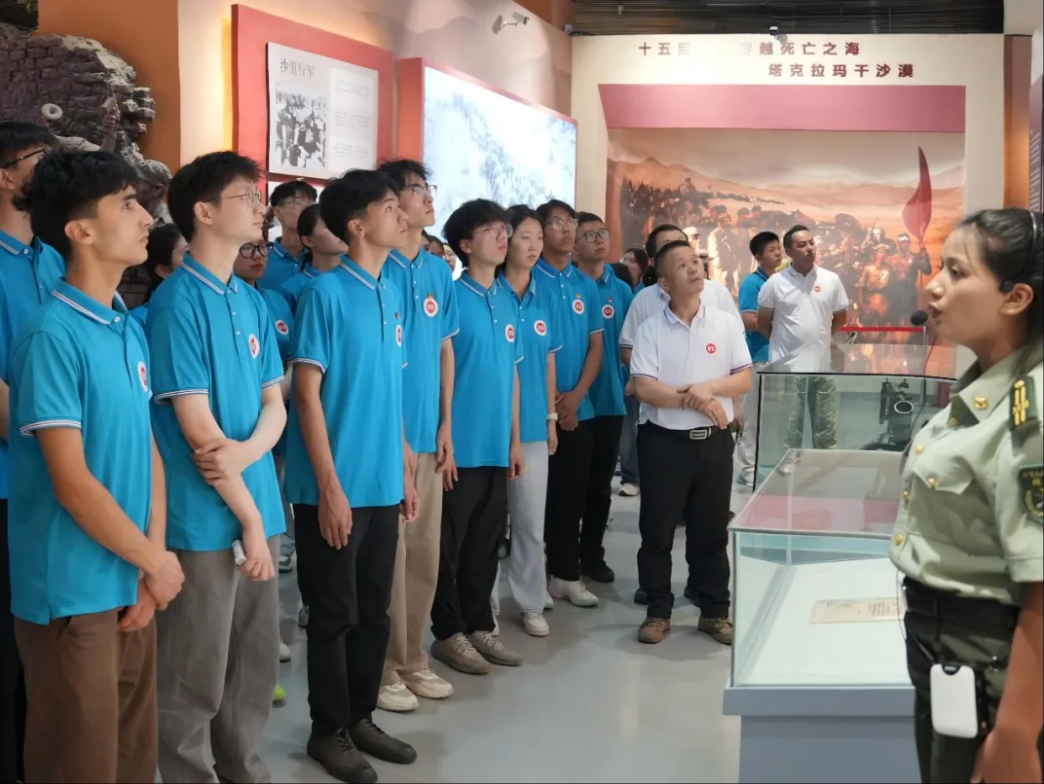 在库尔班·吐鲁木纪念馆内,“骑着毛驴上北京”的动人故事,生动诠释了新疆各族人民对党和国家最朴素、最真挚的情感。在“问勇路”题记前,聆听着英烈们为了捍卫祖国领土、维护国家尊严,不惜牺牲生命的英雄事迹,队员们不禁热泪盈眶,胸膛中激荡的情感最终凝成一句无声却无比坚定的誓言——“清澈的爱,只为中国”。