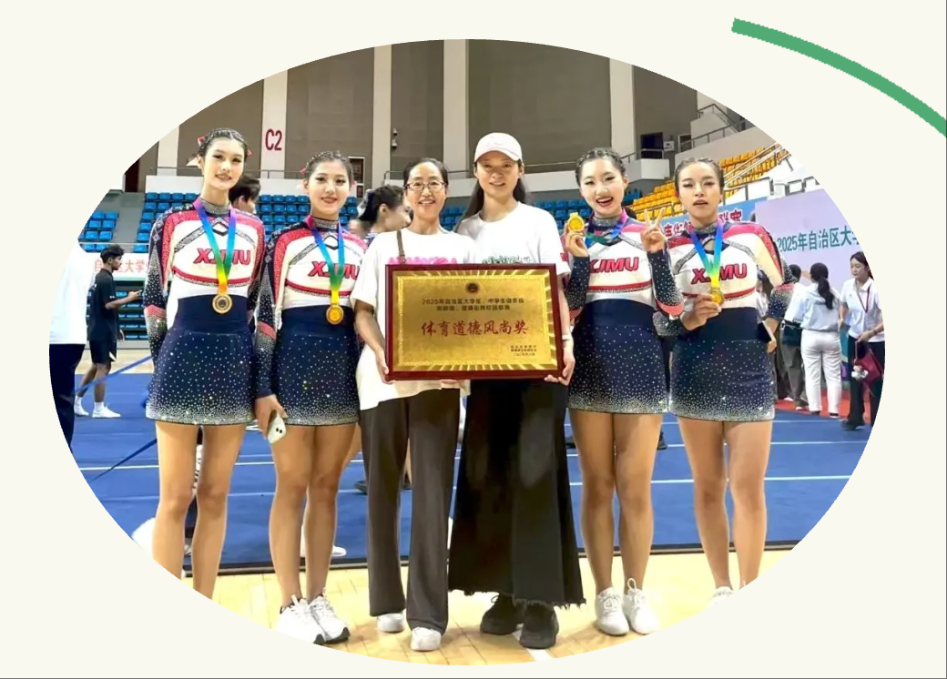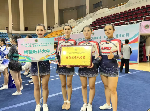 本次比赛中,新疆医科大学啦啦操竞训队以高难度的技巧动作、富有创意的编排和极具感染力的舞台表现,呈现了一场力与美的视觉盛宴,从一众强队中脱颖而出,凭实力征服了评委与观众,完美展现了新医学子的青春风采!