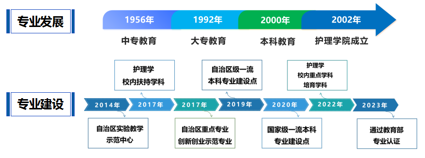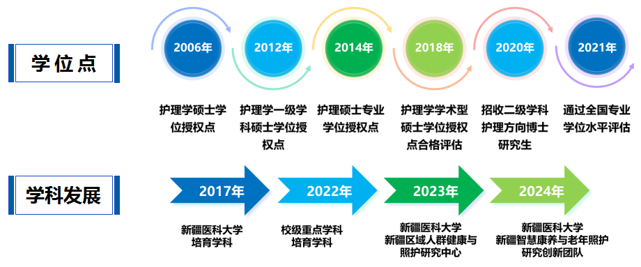 新疆医科大学护理教育始于1955年,2000年开设护理学本科教育,2006年获批护理学硕士学位授权点,2012年获批一级学科护理学硕士学位授权点,2014年获批护理硕士专业学位授权点,形成了完整的本硕博人才培养的体系。护理学实验中心2014年获批自治区级实验教学示范中心;护理学专业2017年获批自治区重点专业创新创业示范专业,2019年获批自治区级一流本科专业建设点,2020年招收二级学科护理方向博士研究生,2020年获批国家级一流本科专业建设点,2023年以有效期6年通过教育部护理学本科专业认证;2024年获批自治区科协“新疆应急救护科普教育基地”。护理学专业2024年获评软科中国大学专业评级 B+。历经70年的发展,形成了以本科教育为主体、积极发展研究生教育的格局。