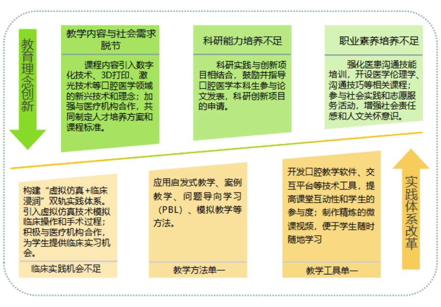 口腔医学以“教育理念创新——实践体系改革”双重维度展开探索。以新医科“医学、教学、科研、创新”多元协同理念为引领,提出教育理念改革,将新医科概念与社会医疗健康需求紧密结合,提高口腔医学人才的临床能力和科研水平。
