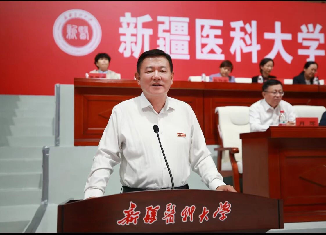 柴林勉励全体新生要深刻理解并自觉传承学校深厚的红色底蕴与新医精神,将个人理想融入健康中国、健康新疆的建设伟业,在新医这片沃土上书写无愧于时代、无愧于人民的青春华章。他围绕“德、智、体、美、劳”五大方面,对全体新生提出了殷切期望和成长指引。一是以德铸魂,筑牢精神之基。希望新医学子始终高扬爱国主义旗帜,自觉传承学校“扎根边疆、从医为民”的红色基因与崇高精神,不断铸牢中华民族共同体意识,主动参与各类融情实践与志愿服务,用实际行动厚植家国情怀、强化使命担当,努力成长为信仰坚定、堪当民族复兴重任的新时代医学人才。二是以勤精术,锻造过硬本领。我们要将勤奋作为从医之路的基石,主动构建贯通融合的知识体系,聚焦新疆特高发疾病防治、特色药用资源开发等区域健康问题,探索运用基因技术、智能医学、大数据分析等新工具、新方法,在解决真实问题中锤炼扎实本领,为将来应对各种挑战奠定坚实的能力基础。三是以体强身,练就强健体魄。要率先成为健康生活的践行者和示范者,将体育锻炼融入日常生活,让运动成为习惯,让健康成为常态。多给身体充电、多为社交扩容,永葆乐观之心、常怀豁达之态,为将来承担救死扶伤的重任积蓄充沛的身心能量,以昂扬的姿态迎接医学道路上的各种挑战。四要以美润心,涵养人文情怀。要始终保持对医学之美的热爱、对职业初心的敬畏,牢固树立生命至上、健康所系的价值理念,感知冷暖、体恤疾苦,以仁心仁术书写医者的尊严与担当,成长为有温度、有情怀、懂尊重、善关怀的新时代良医。五要以劳笃行,锤炼实干担当。要体会传承“好学、力行、笃医、创新”的校训,做好长期奋斗、不怕吃苦的思想准备,重视临床实习与实践教学,积极参与基层义诊、健康宣教等志愿服务,将理论所学淬炼为临床实战的真本领,在躬身实践中成长为人民信赖的健康守护者。愿同学们在未来数年的时光里,以执着的信念、坚定的脚步追光逐梦,在接续奋斗中不断擦亮新疆医科大学这块“金字招牌”,成长为推进国家富强、民族复兴的先锋力量!