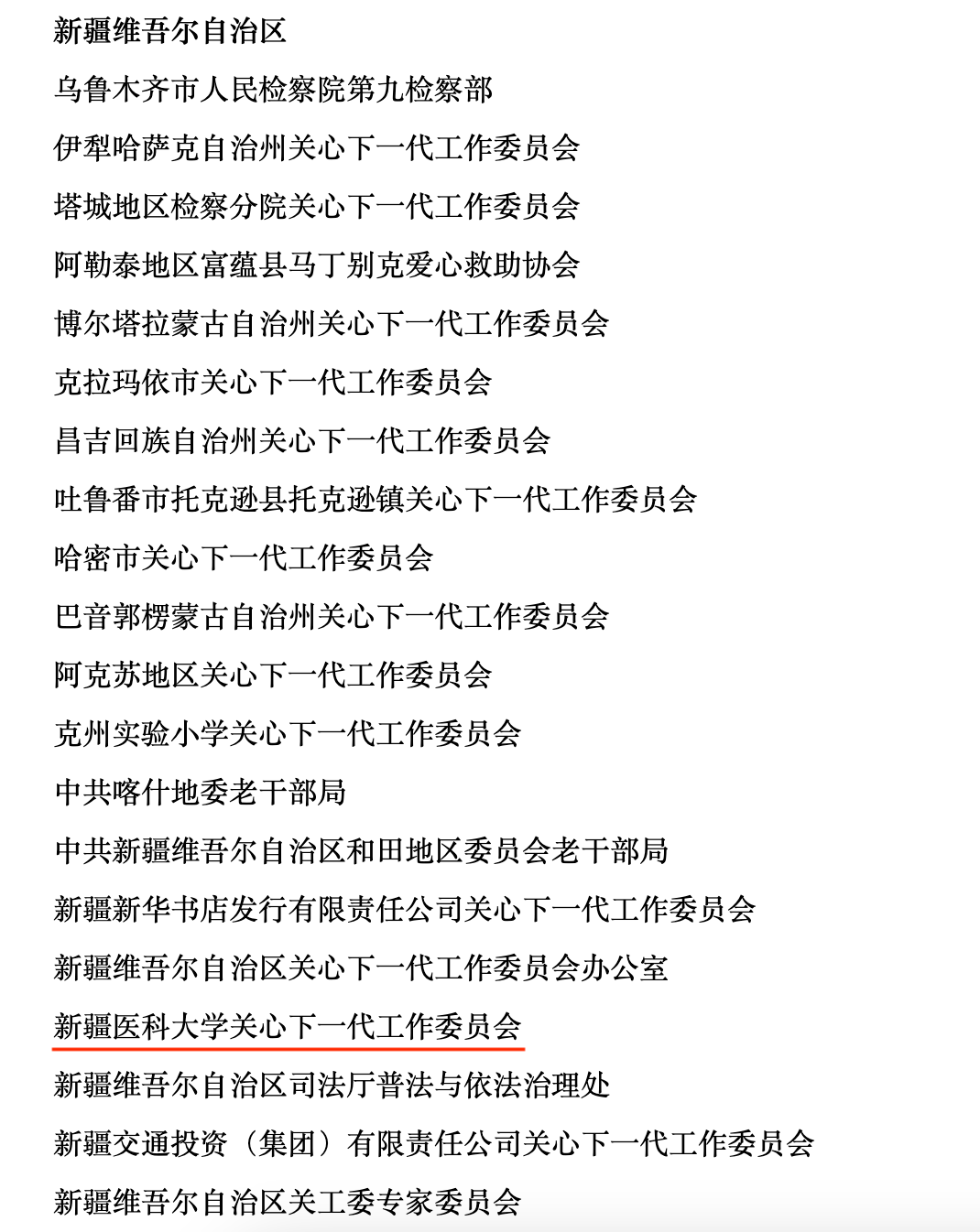 近日,在北京举行的纪念中国关心下一代工作委员会成立35周年暨全国关心下一代工作表彰大会上,新疆医科大学关心下一代工作委员会荣获“全国关心下一代工作先进集体”称号,成为自治区受表彰的20个先进集体之一。