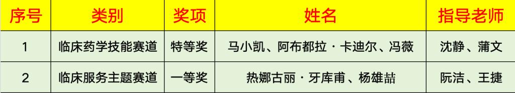 临床药学专业学生热娜古丽・牙库甫、杨雄喆组成团队,在临床药学服务主题赛道中斩获一等奖,指导老师为第一附属医院(第一临床医学院)药学部阮洁、王捷老师。