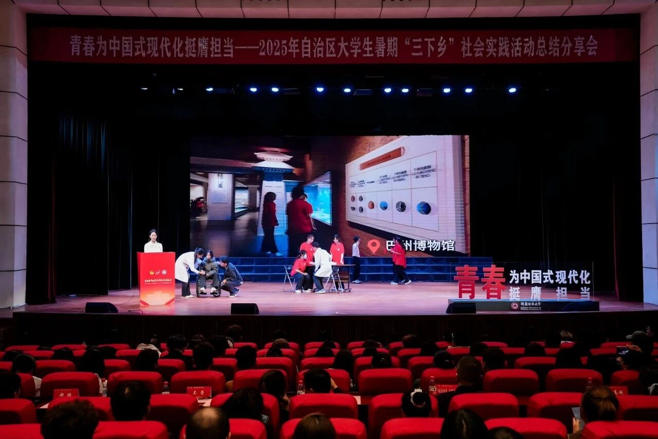我校荣获2025年自治区大学生暑期“三下乡”社会实践活动优秀组织单位,“医科石榴籽”健康丝路行实践团荣获优秀团队,校团委沈雪丽荣获优秀指导教师。总结分享会上我校“医科石榴籽”健康丝路行实践团进行了情景剧汇报演出。