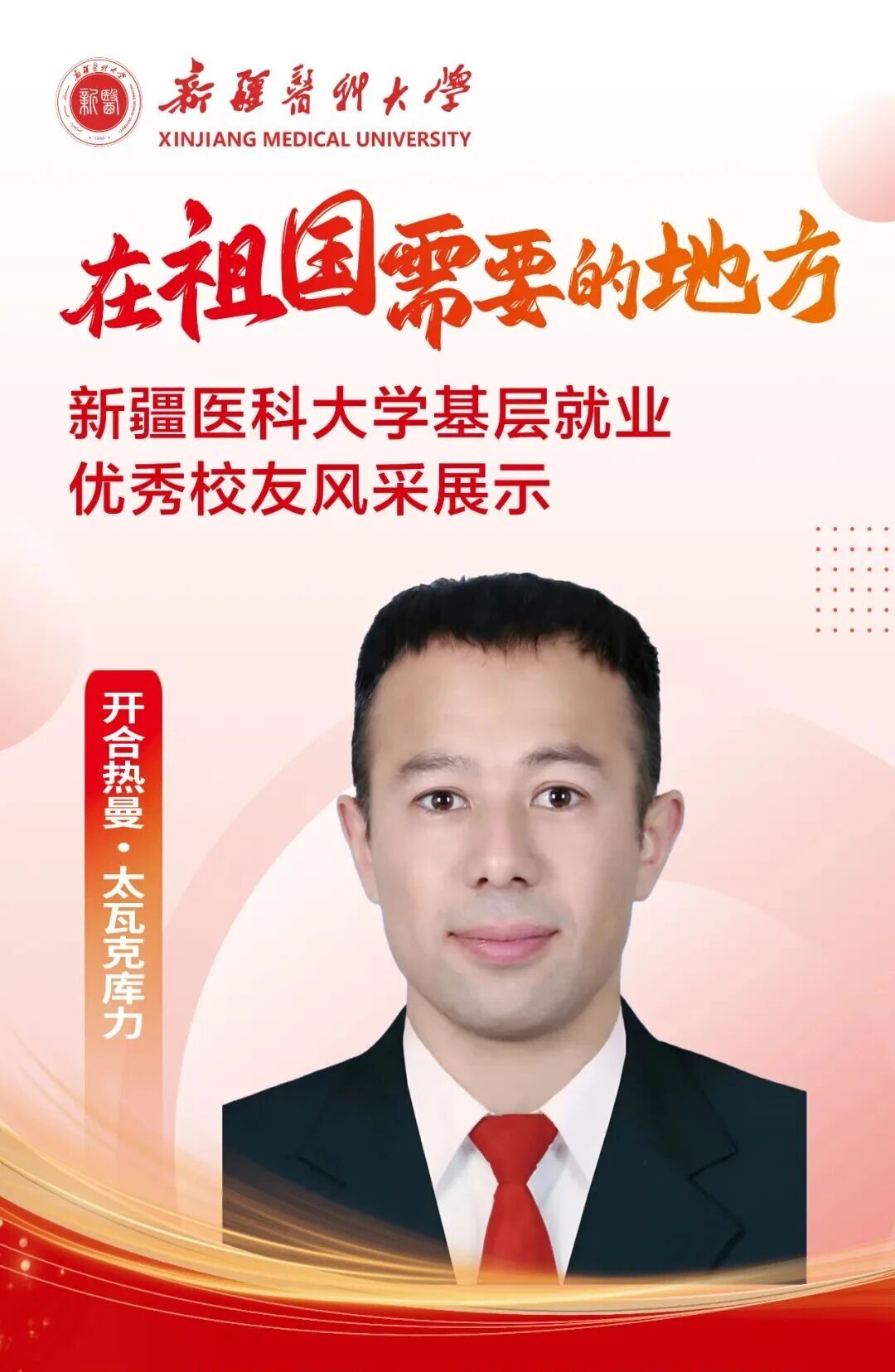 答案,往往书写在祖国最需要的地方。自建校之初,一代代新医人把个人理想融入国家命运,响应祖国号召,扎根边疆、护佑生命,这份初心如星火燎原,成为照亮新医人永不褪色的精神底色。基层,是砥砺初心的最好课堂,是施展才华的广阔舞台,呼唤着青春的智慧与力量,也必将成就人生的梦想与价值。为唱响“到祖国最需要的地方去”的青春强音,新疆医科大学官微特别推出三期《新医优秀校友的“基层答卷”》系列专题,为您讲述我校24位优秀校友扎根基层、服务人民、奉献青春的动人故事。从救死扶伤的一线,到乡村振兴的前沿,他们赓续着新医的红色血脉,把论文写在大漠边疆,把手术台搭在雪山脚下,将仁心仁术深深镌刻在天山南北,用实际行动浇灌出最美的民族团结之花。他们的选择,是对青春价值的最佳诠释;他们的奋斗,是对报国誓言的最美践行。让我们一同走进这些平凡而伟大的身影,汲取前行的榜样力量!