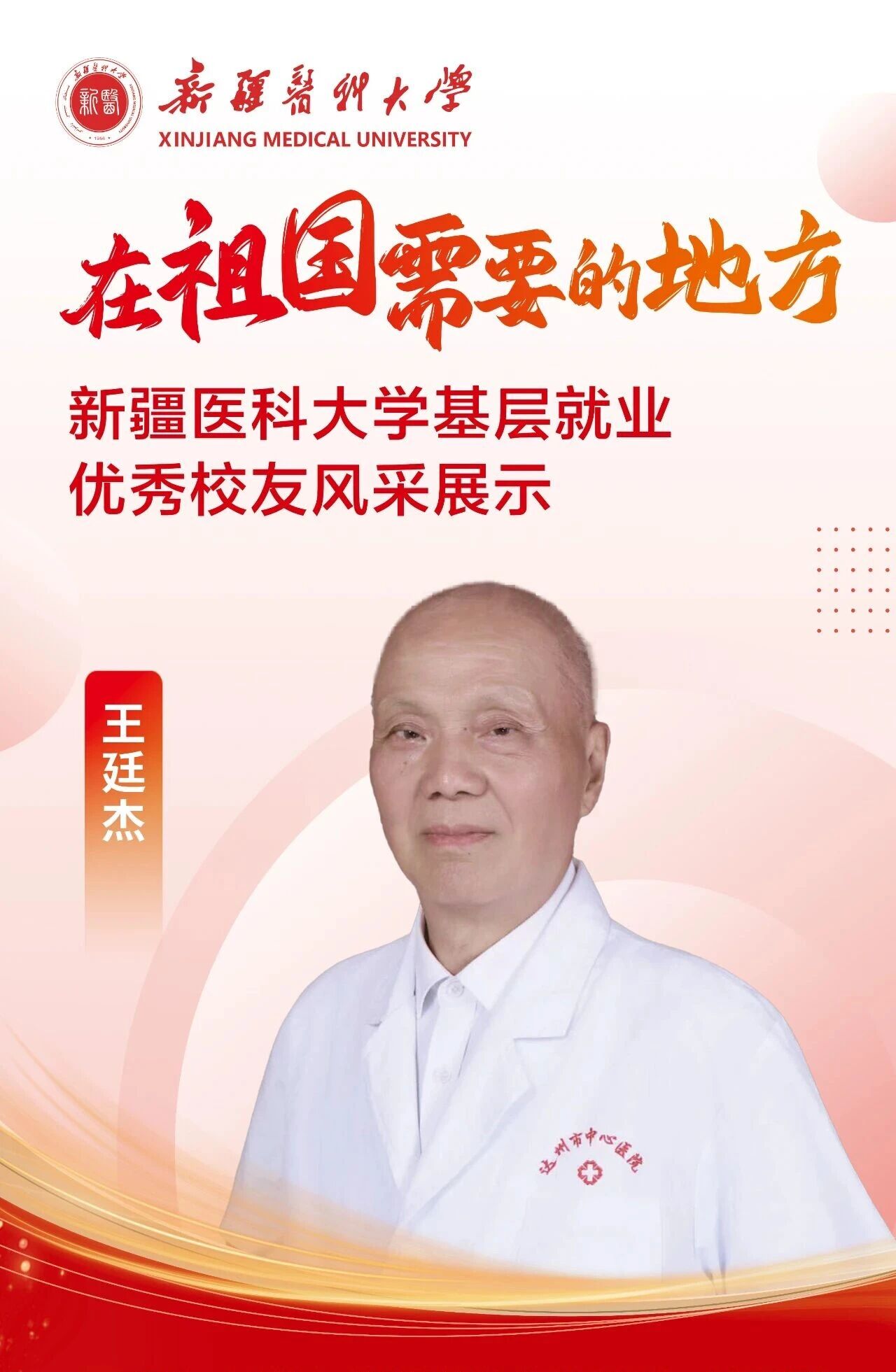 王廷杰,中共党员,1969年毕业于临床医学院临床医学专业,现为四川达州市中心医院医生。本科毕业后来到巴州库尔勒的一家煤矿企业工作,救治一氧化碳中毒矿工。他每月花1/3的工资订阅医学书刊坚持学习,1979年9月,考回新疆医科大学攻读呼吸专业研究生,1982年4月获学校首批医学硕士学位。