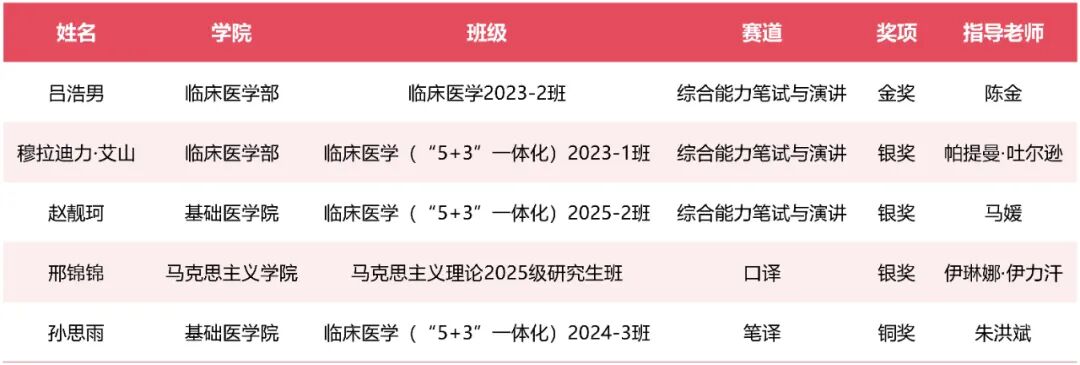 近日,2025年外研社“国才杯”“理解当代中国”全国大学生外语能力大赛(英语组)新疆赛区选拔赛在石河子大学落幕。我校在本科国际传播综合能力笔试与演讲、本科笔译、本科口译三大核心赛道中全力拼搏,最终取得了1项金奖,3项银奖和1项铜奖的好成绩,其中临床医学部临床医学2023-2班的吕浩男同学成功获得晋级本科国际传播综合能力大赛国赛的资格,我校荣获“优秀组织奖”。
