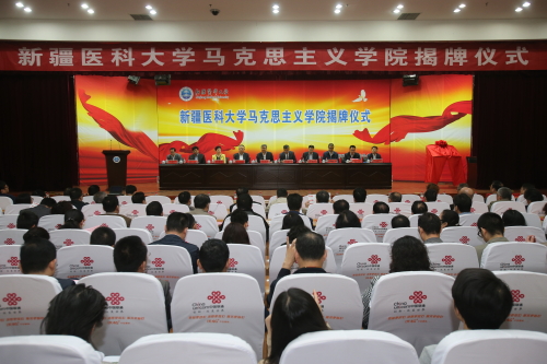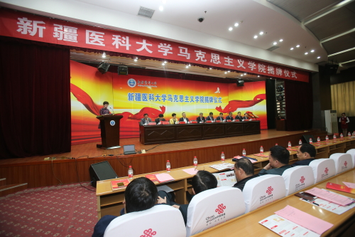 2017年4月25日上午,新疆医科大学马克思主义学院揭牌仪式在八百人会议室隆重举行。校党委书记高发水在揭牌仪式上指出,新疆医科大学马克思主义学院的揭牌标志着我校思想政治教育又迈上了一个新的台阶。责任在肩,使命光荣。马克思主义学院的广大教师要担当起时代的重托,坚持不懈传播马克思主义科学理论,抓好马克思主义理论教育,为学生一生成长奠定科学的思想基础。要坚持不懈培育和弘扬社会主义核心价值观,引导全校广大师生做社会主义核心价值观的坚定信仰者、积极传播者、模范践行者。要坚持不懈促进学校和谐稳定,通过思政课培育学生理性、平和、健康的心态,加强人文关怀和心理疏导,把我校建设成为安定团结的模范之地。