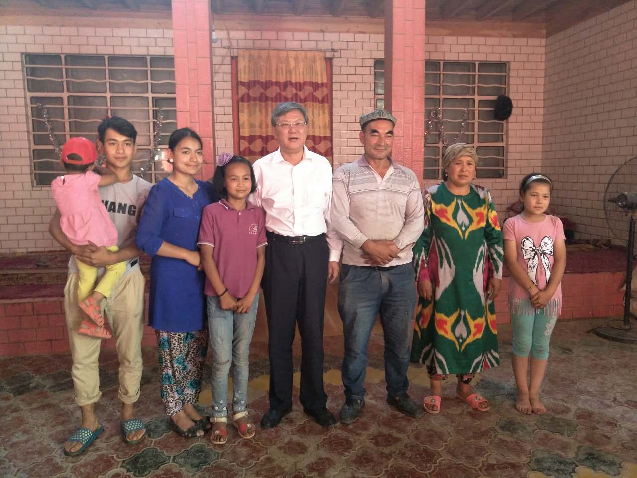 高发水书记一行在新疆医科大学党委副书记、纪委书记、新疆医科大学驻墨玉县前方(临时)党工委书记,“访惠聚”工作队总领队亚克夫·吐尔地同志的陪同下,来到了墨玉县普恰克其乡阿亚格亚尕其村3组29号,普恰克其乡长麦麦提阿不拉·买托乎提带着大家来到了新疆医科大学语言文化学院临床医学(免费医学生)2017-1班的帕孜来提罕·艾比布拉的家。据帕孜来提罕·艾比布拉介绍,她有一个大家庭,她本人在家中排行老二,还有一个姐姐在吉林上大学,一个弟弟在上内高班,还有两个上小学的妹妹。高发水书记听到她的介绍后,高兴地说道:“你的家庭有着良好的教育氛围,同时有三个孩子外出上大学和高中,很难得也很不容易,说明你的父母重视孩子的教育”。高发水书记热情地与帕孜来提罕·艾比布拉的父母打招呼,拉着他们的手围坐在一起聊起了家常。高书记说:“作为高校的学生,作为医科大学的学生,要切实提高思想认识,遵守各项法律法规和学校的校纪校规,努力学习科学知识学好自己的专业” 。然后握着她父亲的手,说道:“您培养了优秀的孩子,3个孩子在外求学,家里负担很重,学校会认真研究对这样家庭学生的特殊资助政策,支持和鼓励孩子们安心学习,请相信我们一定会好好教育孩子,把他们培养成为社会主义事业的合格建设者和可靠接班人!家长也要真正地关心爱护孩子,鼓励他们好好学习,要听党话、感党恩、跟党走!”