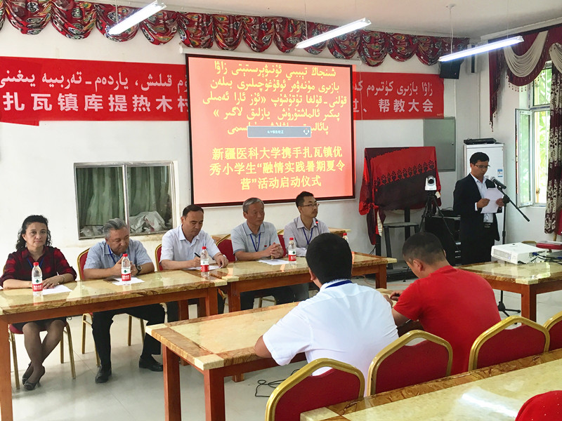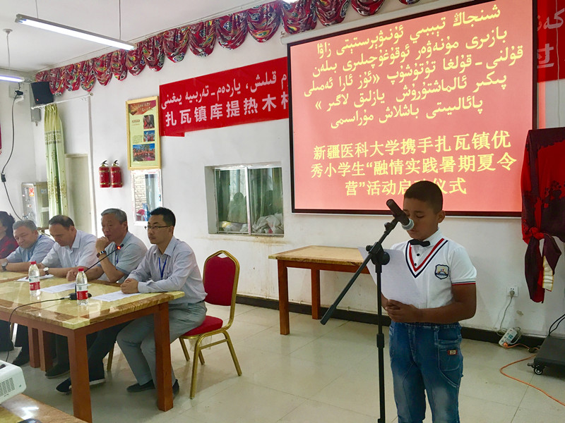 首先,新疆医科大学驻库提热木村工作队队长赵鸿锴介绍了此次夏令营活动的基本情况。新疆医科大学团委积极响应自治区党委开展各民族文化交流交融活动和自治区团委工作部署的要求,协同新疆医科大学驻墨玉县扎瓦镇8个住村工作队,从所驻村的学校中筛选出30名思想品德端正、学习成绩优秀的小学生,组成了此次“融情实践暑期夏令营”。夏令营的营员们将与新疆医科大学子女学校的优秀学生代表“结对子”,共同开展一系列主题活动:参观新疆博物馆、新疆科技馆、乌鲁木齐市红山公园、乌鲁木齐市海洋馆以及新疆医科大学等高等学府,在耳濡目染中,了解新疆日新月异的社会发展成就、领会现代文化的魅力、感悟高校知识殿堂的律动、体味民族团结一家亲的温暖……随后,夏令营的带队教师和优秀学生代表进行了主题发言,来自库提热木村小学的依力亚斯·阿力马斯兴奋地说:“这次夏令营对我来说,是一次难得的机会。我一定会遵守纪律,认真学习,回来后,把我的经历分享给同学们。”