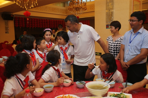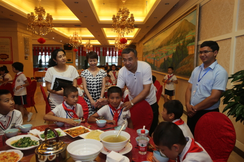 7月11日中午,新疆医科大学凯赛尔·阿不都克热木校长到餐厅看望了正在午餐的参加今年“手拉手,心连心”融情实践夏令营的孩子们。