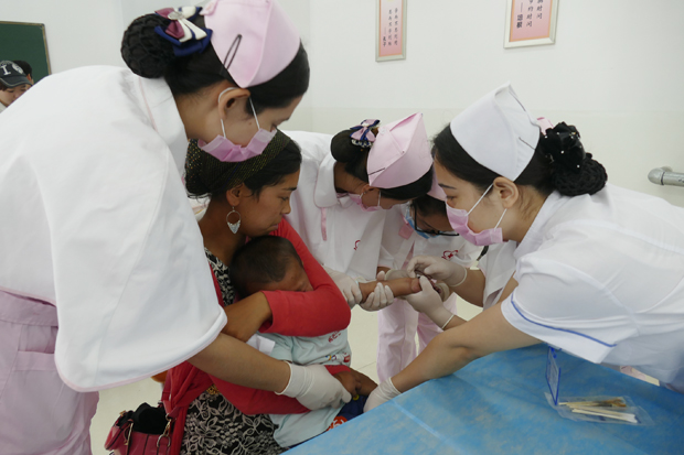 护理部从全院各科室抽调300余名护理人员,专职负责病房患儿术前术后护理工作,其中包括150余名南丁格尔志愿者。他们的职责除了坚守在病区进行医疗护理之外,还需要负责患儿的术后康复指导,并且护理队伍尽量选用少数民族,便于和患者及家属沟通。