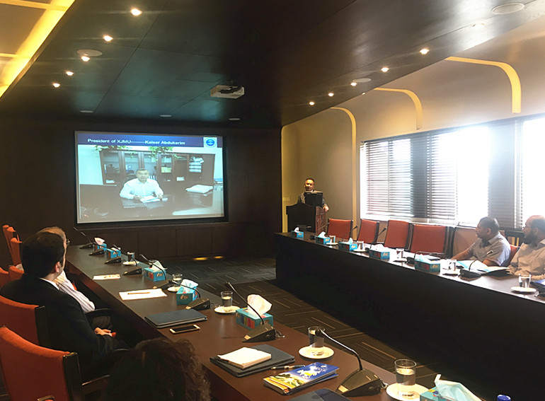 在巴基斯坦医学联盟中心(CPSP),我校代表团参观了高等学历教育考试中心,在CPSP远程网络办公室里,我校校长凯赛尔•阿不都克热木教授与巴基斯坦医学联盟主席(Prof ZAFAR ULLAH CHAUDHRY)进行了电话会谈,双方表示进一步加强各领域合作。