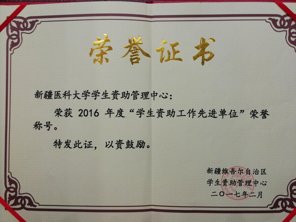 近日,在自治区高校资助工作第一次表彰会上,新疆医科大学荣获2016年度“学生资助工作先进单位”,学生处学生资助管理中心季俊红老师荣获“2016年自治区学生资助工作先进个人”荣誉称号。此次评选是自治区教育厅通过对2011-2015年各学校资助工作评审,并结合2016年自治区资助工作专项审计情况进行的评比,我校是此次资助工作评比中获得两项荣誉称号的三所高校其中之一。