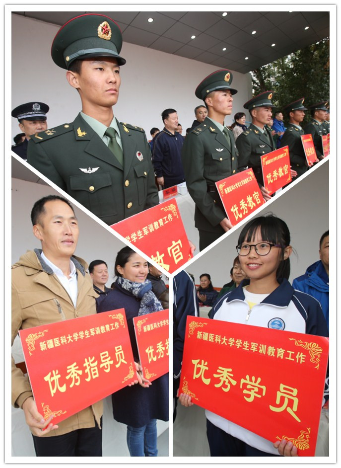 校党委常委、副校长热娜•卡斯木宣读了新疆医科大学2017年学生军训工作表彰决定。学校授予许胜、盛威等15名承训教官“优秀教官”荣誉称号,授予李芳芳、杜磊等21名学工干部“优秀指导员”荣誉称号;授予黄卓雅、木合塔尔•麦麦提等128名参训新生“优秀学员”荣誉称号。大会对获得优秀的教官、优秀指导员、优秀学员颁发了荣誉证书和奖品。