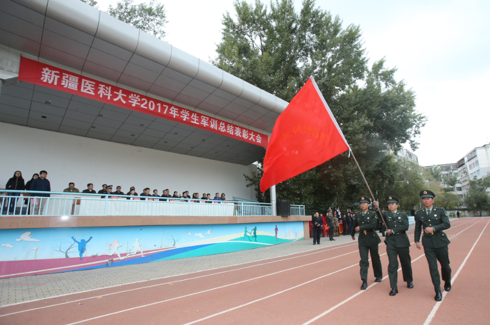 今天(9月30日)下午,新疆医科大学田径场上军旗猎猎、口号嘹亮,2017级学生军训总结表彰大会在此举行。校党委副书记、校长凯赛尔•阿不都克热木,校党委常委、副校长热娜•卡斯木,陆军十一师火箭炮营营长陈强出席大会。校党委常委、副校长曹忠明主持大会。全体承训教官,学生处、团委、派出所、保卫处相关职能处室领导和各学院主管学生工作领导、政治辅导员、班主任、全体新生参加了大会。