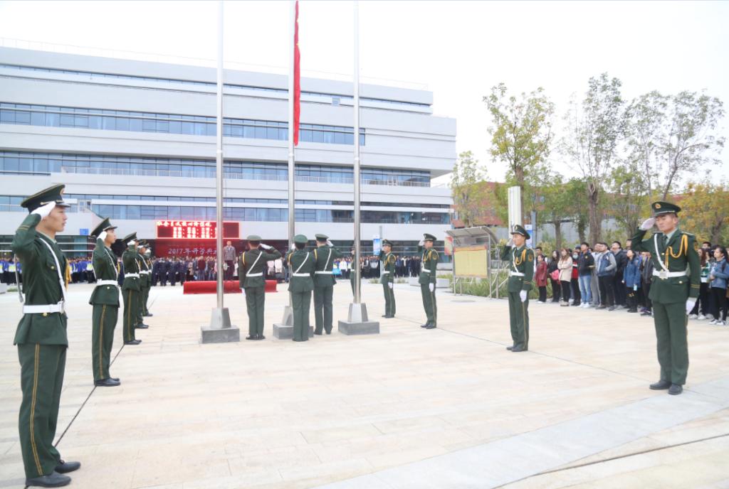 今天一大早,校本部中心广场,各族师生整齐列队、庄严肃立,静静等待护旗方队的到来。9时整,21名国旗班护卫护送着鲜艳的五星红旗步伐矫健地向国旗杆走来。在雄壮的国歌声中,全场师生齐声高唱国歌,注视着五星红旗迎着朝阳冉冉升起。