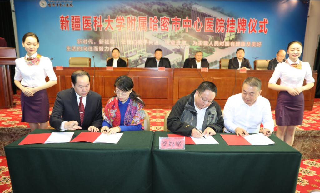 挂牌仪式上,新疆医科大学第一附属医院、附属中医医院与哈密市中心医院;附属肿瘤医院与哈密市第二人民医院;第六附属医院与哈密市维吾尔医医院分别签订了医联体合作协议。